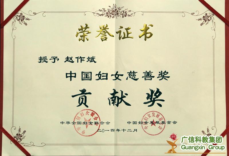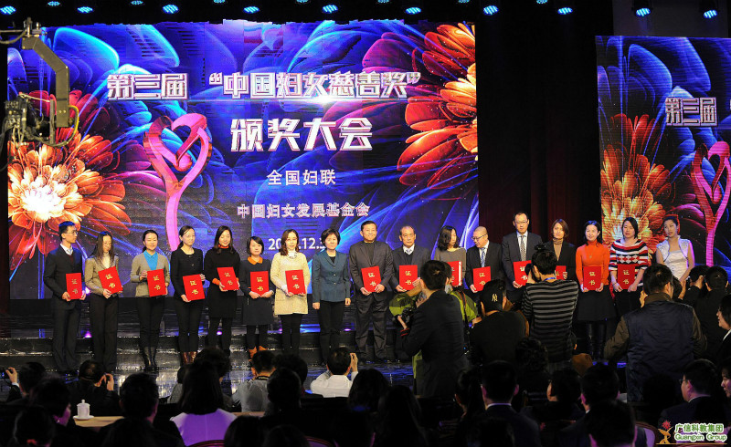 本網(wǎng)訊(記者 劉勝懷 通訊員 田天)2014年12月30日,全國(guó)婦聯(lián)、中國(guó)婦女發(fā)展基金會(huì)主辦的第三屆“中國(guó)婦女慈善獎(jiǎng)”頒獎(jiǎng)大會(huì)在京舉行,對(duì)2013-2014年度為女性公益慈善事業(yè)做出貢獻(xiàn)的單位及個(gè)人進(jìn)行了表彰。廣信科教集團(tuán)董事局、總裁趙作斌被授予“中國(guó)婦女慈善獎(jiǎng)”貢獻(xiàn)獎(jiǎng)榮譽(yù)稱號(hào),全國(guó)僅31人獲此殊榮。全國(guó)人大常委會(huì)副委員長(zhǎng)、全國(guó)婦聯(lián)主席沈躍躍,全國(guó)婦聯(lián)黨組書記、副主席、書記處第一書記宋秀巖為獲獎(jiǎng)的單位和個(gè)人頒獎(jiǎng)。集團(tuán)副總裁呂家燕女士代表趙總裁出席頒獎(jiǎng)典禮并領(lǐng)獎(jiǎng)。