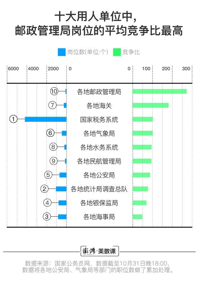每到公務(wù)員考試季,考公務(wù)員“吃不吃香”,哪些崗位出現(xiàn)了“報(bào)名千人、只招一個(gè)”的極端情況,這樣的問(wèn)題常被反復(fù)討論。澎湃新聞通過(guò)國(guó)家公務(wù)員局官網(wǎng)所提供的報(bào)考詳細(xì)數(shù)據(jù),分析了各類公務(wù)員崗位的“競(jìng)爭(zhēng)比”(某崗位“競(jìng)爭(zhēng)比” = 某崗位報(bào)名人數(shù)/該崗位錄取人數(shù))。
