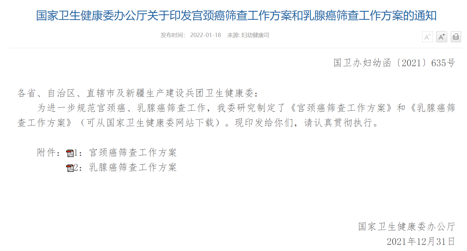 1月18日,國家衛(wèi)生健康委發(fā)布《宮頸癌篩查工作方案》和《乳腺癌篩查工作方案》,提出為適齡婦女提供宮頸癌、乳腺癌篩查服務(wù)。篩查服務(wù)對象范圍由以往的農(nóng)村適齡婦女?dāng)U大為城鄉(xiāng)適齡(35至64周歲)婦女,優(yōu)先保障農(nóng)村婦女、城鎮(zhèn)低保婦女。